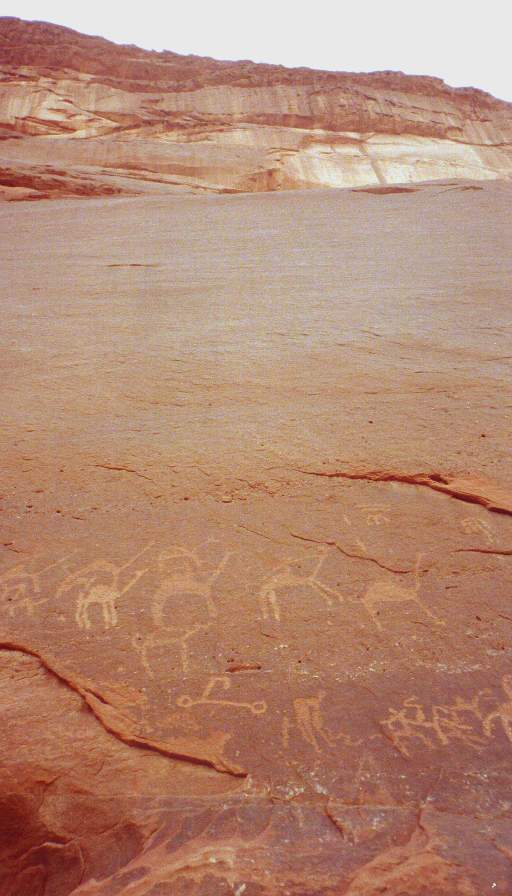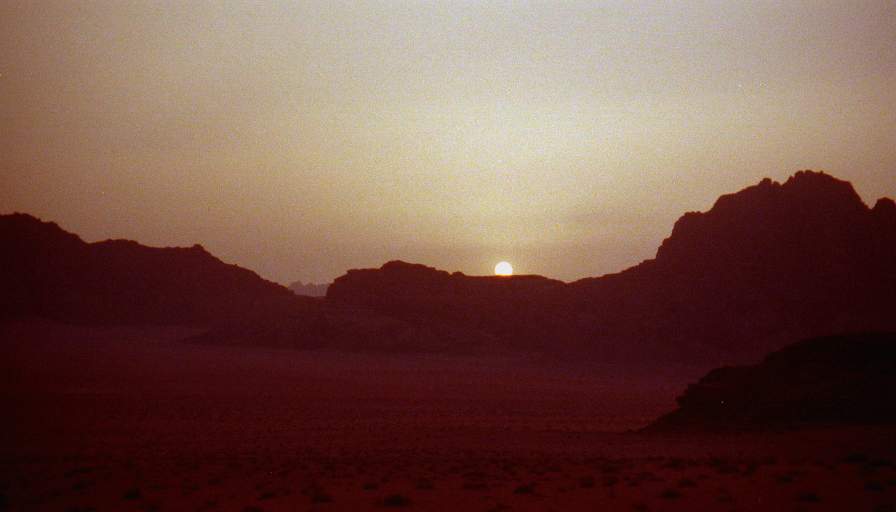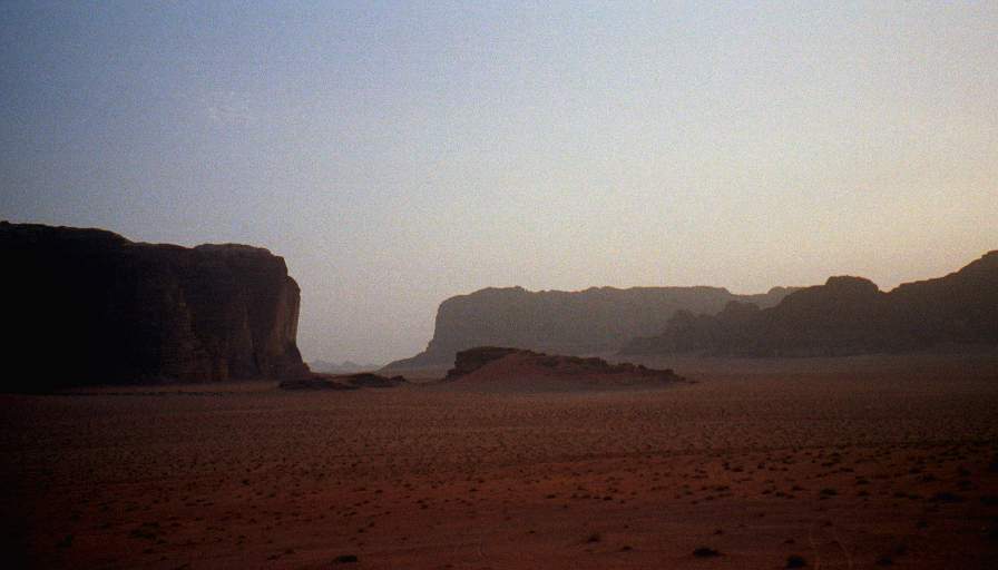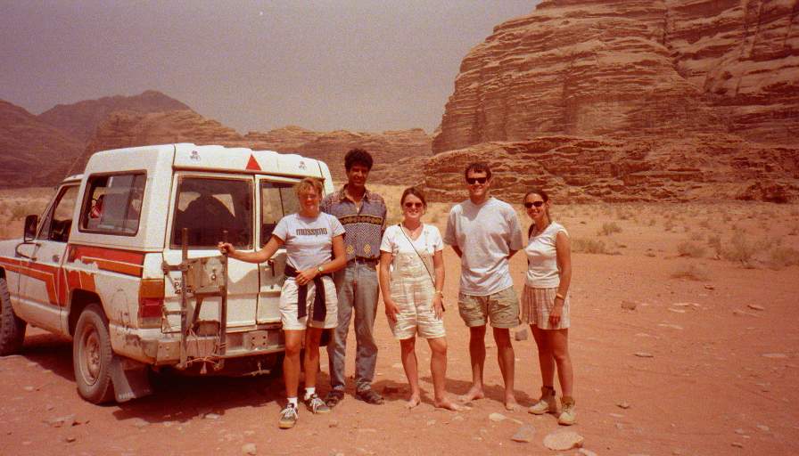 Caught the 6am bus for Wadi Rum. Got to the desert about 8am. Three Australian girls (Jody, Meradeth, and Karen) who had been staying at the same place in Petra were also on the bus and we decided to pool our resources for hiring a 4 WD and driver to take us out in the desert for the day and bring us back tomorrow. We found a driver, negotiated a deal, then hiked away from the government camp to be picked up (we'd way undercut the official price so he couldn't be seen by the tourist police picking us up). Had tea at our Taeg's (our driver) house while Jody went with him to get food for dinner. They took awhile because Jody had to wait at the store while they slaughtered and dressed the chickens.