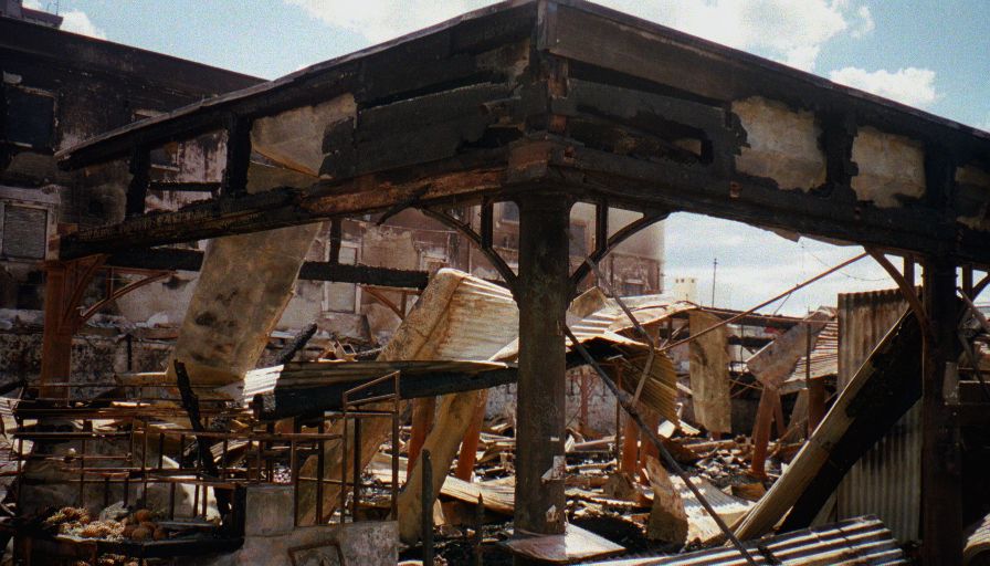 Back in Port Louis I headed to the Central Market - only to find out it had burned down (again according to the guide books) - four days ago! I walked around the little part of it that wasn't destroyed then took a closer look at the gutted market. It was pretty vivid stuff - along the edges there was still recognizable stuff - burned onions and potatoes here, singed pineapples there, a few melted fans, lot's of unrecognizable melted masses, and worst of all the melted and deformed cages of what was obviously a booth where live animals were kept.