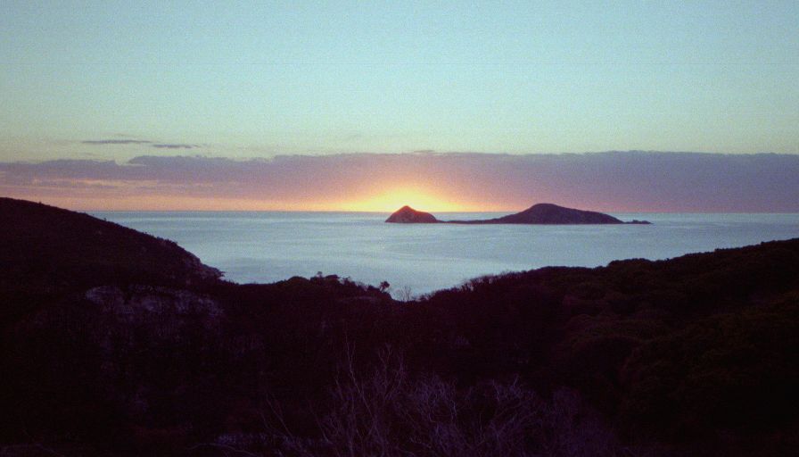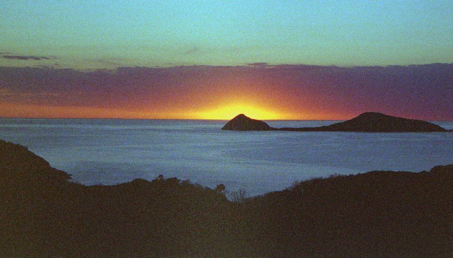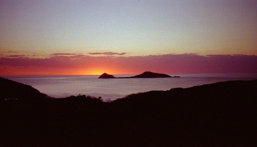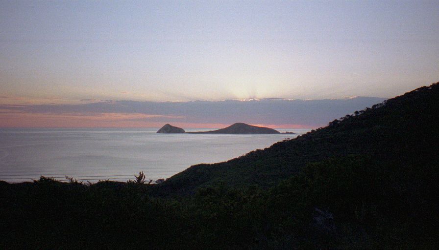 I decide to still head for Wilsons Promontory even though I'm running nearly eight hours later than planned, and I'm an hour farther away. The drive down isn't exciting. The highlight was stopping for diner at Mc Donald's (which would have been a lot more of a highlight if I hadn't had lunch there as well). Got to the park around 7:30, but still had another 30 km to go before getting to the camp ground. The drive was slow because there are a lot of kangaroos and wombats on the road - it's actually pretty stressful. A few kilometers before the camp site I have to pull off for the most incredible sunset (must have taken fifteen photos) - very pink behind this perfect little mountainous island. Pull in the the camp ground and find a site - there are wombats everywhere and they completely ignore people. They look like bear cub sized beavers with koala-like faces. Hung out with the campsite next door (two Canadian guys, an English, and a Dutch) drinking port and talking about traveling (they'd all spent time in Asia, and one of the Canadians had been all around Australia over the last year).