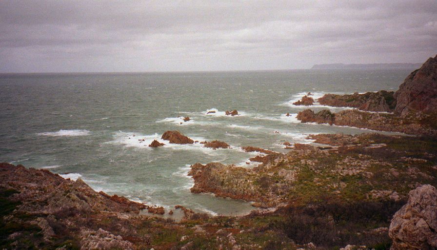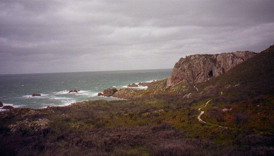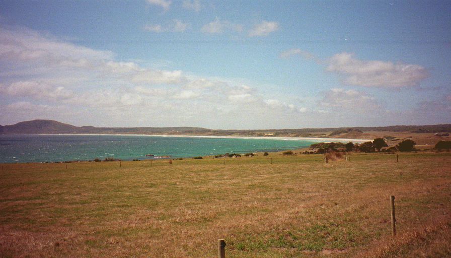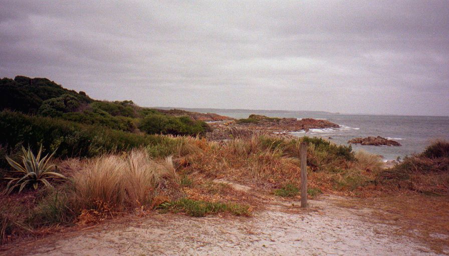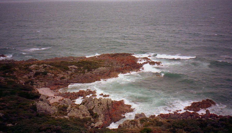 Stopped at Stanley, a small town on the end of a peninsula with Circular Bluff looming over it. Circular Bluff (usually called "The Nut") is a big rock about 1,500 feet high. It was way to windy (it's even more windy now) to climb but the view is nice and the storm surf is beautiful. At one point I got out of the car to take a photo and I couldn't keep my eyes from tearing up long enough to take the picture! So I left. Ended up at Boat Harbor Beach - a small town on a beautiful beach. Checked in to the hostel - deserted, only one other person staying here. Only one restaurant (of two) in town is open so I went and had a magnificent (and expensive) diner then back to the hostel. Sat up talking with this old guy who's staying here. He's definitely a redneck and I had to work at keeping my cool about some of the things he said... when he came up with his solutions to the Australian aboriginal problem ("Shoot the lot of them...") I couldn't deal any more and went to bed.