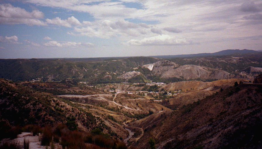 The drive into the mining town of Queenstown is shocking. You're driving through dense rainforest - then suddenly you're on the moon. The ground is almost entirely barren and bleached. Then as you drive into the hills it gets worse - the hills are stained. Most of them a nicotine yellow, others a rusty red, none have any growth and they are all deeply eroded valleys. Apparently all this was rainforest that was cut down to feed the mine's furnaces. The pollution from the copper smelters killed the remaining vegetation and the heavy rainfall stripped the top soil away. The bare rocky earth was stained by the tailings of mines, and the pollution of the smelters. The smelters were shut down more than thirty years ago and still there is barely any life.