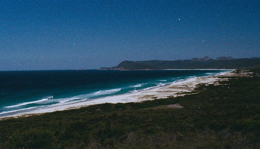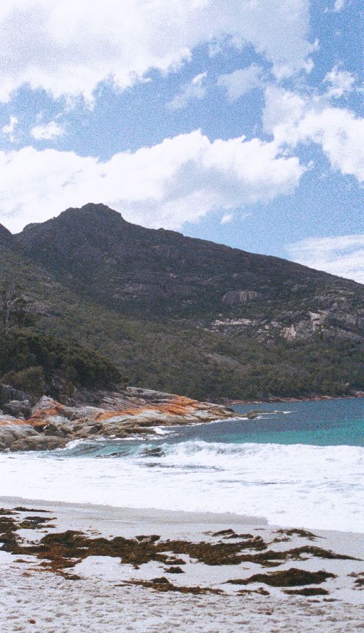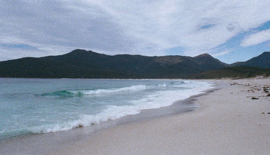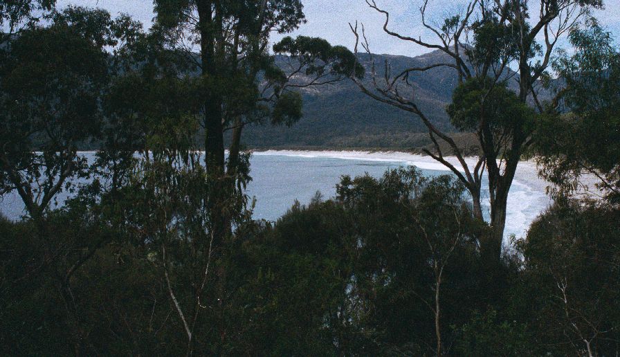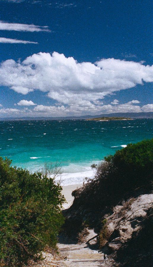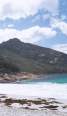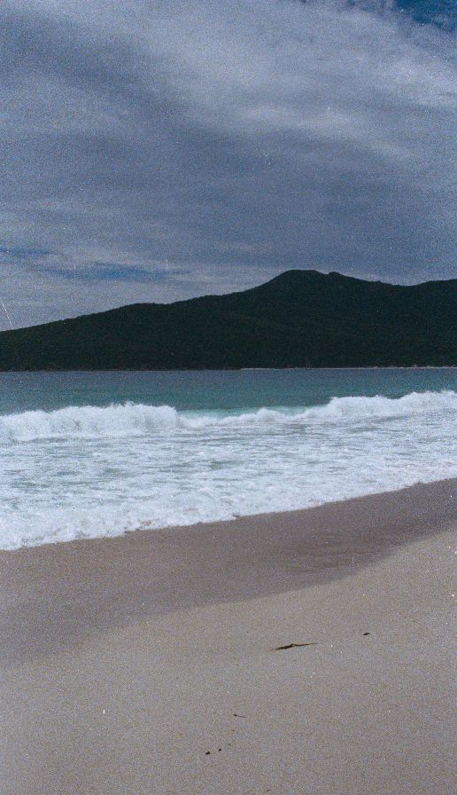 The view point looks down on the incredible clear blue water and brilliant white sand of Wineglass Bay. On a sunny day I'll bet that it is almost to dazzleing to look at! Even with the heavy skies it was still beautiful and bright. On the hike down the skies started to clear, and by the time I got to the bay propper I was wishing I'd brought a swimming suit. There were still clouds in the sky and a coolish breeze, but there was lots of blue peeking through. At the far end of the bay there's a campsite, I suspect it would be absolute paradise to come a camp there for a few days (or months...). Hiked across the narrow peninsula to Hazards Beach. By the time I got there the skies were mostly sunny, but the wind was firece and the whitecapped water was not at all inviting. Walked along the beach to the far end of the cove where the trail headed up in to the hills.
