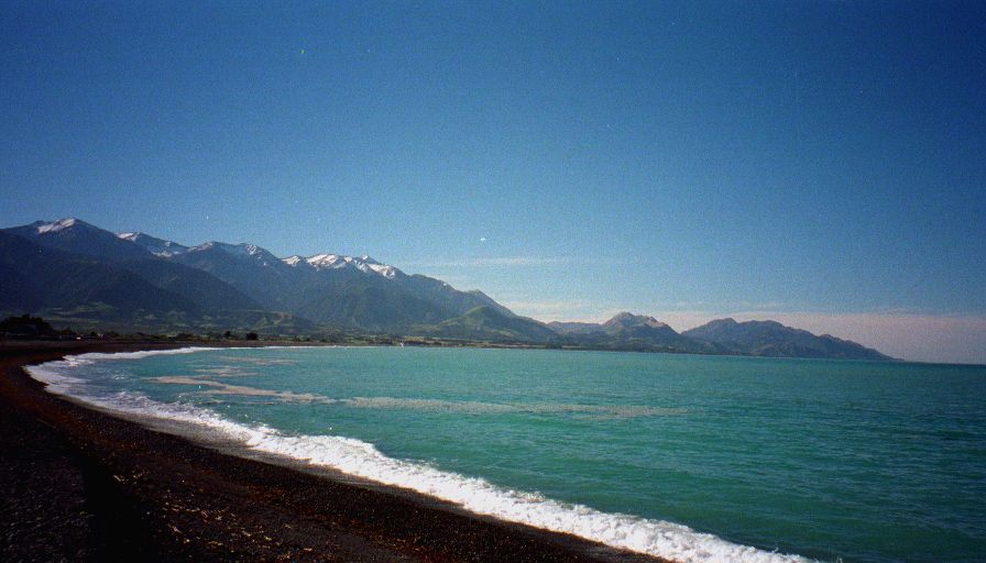 Wandered around Kaikoura - it's even smaller than Picton and ended up on the black pebble beach. Dramatic scenery, the snow capped mountains literally rise straight from the beach. Sat in the sun on the beach until the sun started to go behind the mountains. By then the sand fleas were driving me nuts so I packed it in. Watched some TV at the hostel, then wandered out for diner - ran into people I'd met in Rotorua on the street which was kind of strange. Back at the hostel watched Blade Runner then headed for bed.