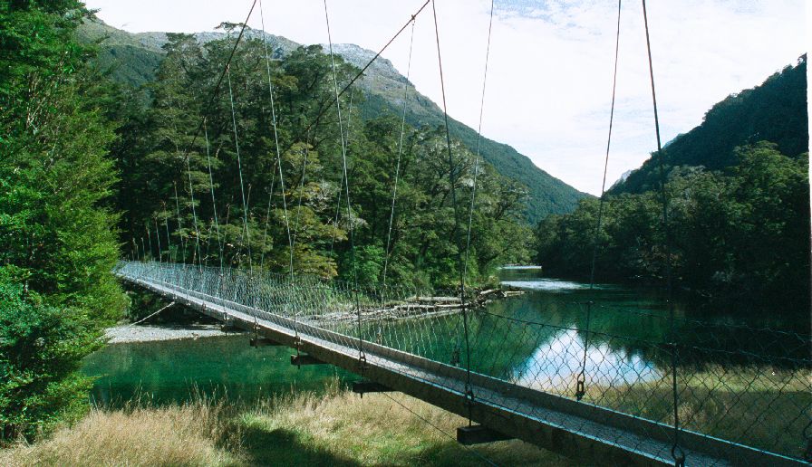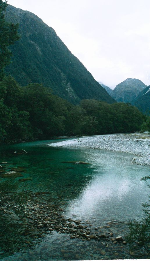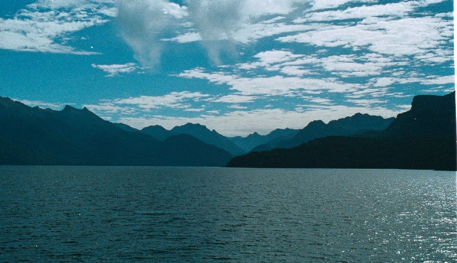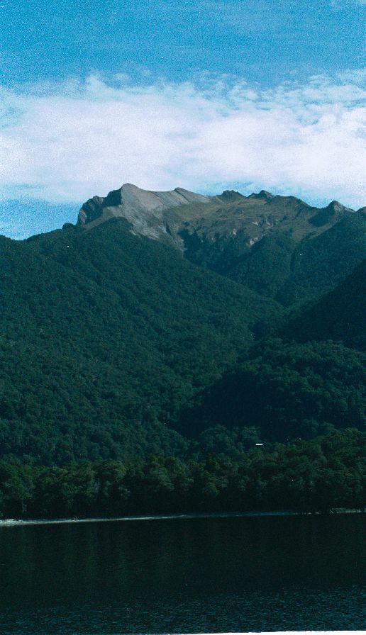 Got up early and finished packing. I'm carrying the lightest possible pack. I put all the stuff I was leaving behind in a box and wrapped several layers of tape around it for security. After I finished I realized that I only left one pair of underwear out! Uh oh. I put the excess in storage then hiked to the park office. I still had a half hour until the shuttle left so I left my pack and quickly ran into town. Bought some way overpriced underwear (expensive hiking stuff) and grabbed a quick breakfast. Barely made it back to the bus in time. The ride was short, just 20 km to the ferry terminal. The hour ferry ride was to the north end of Lake Te Anau and very beautiful.