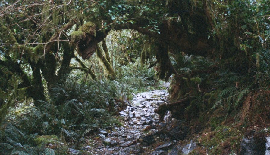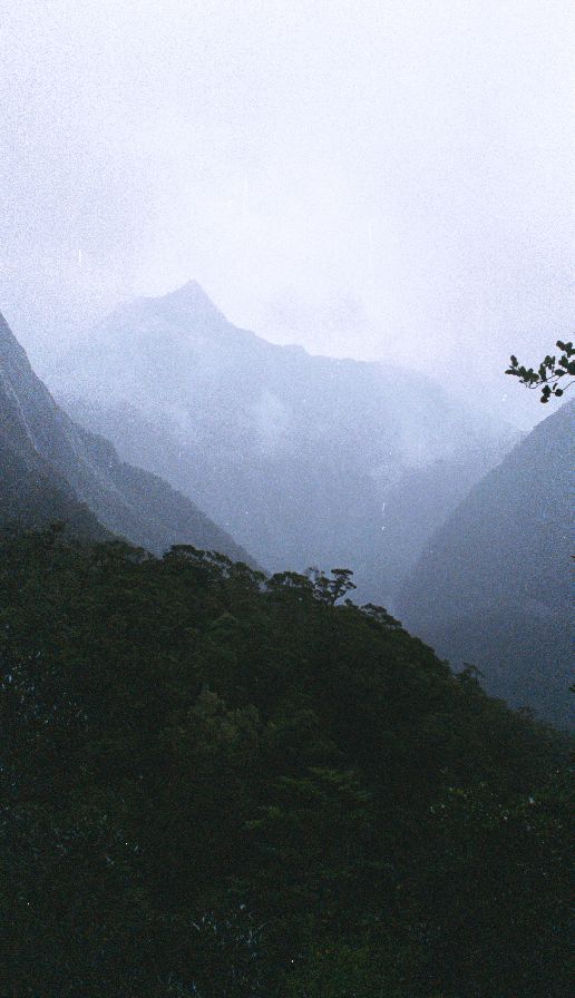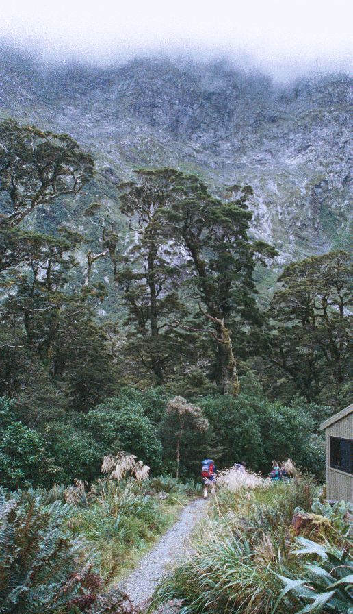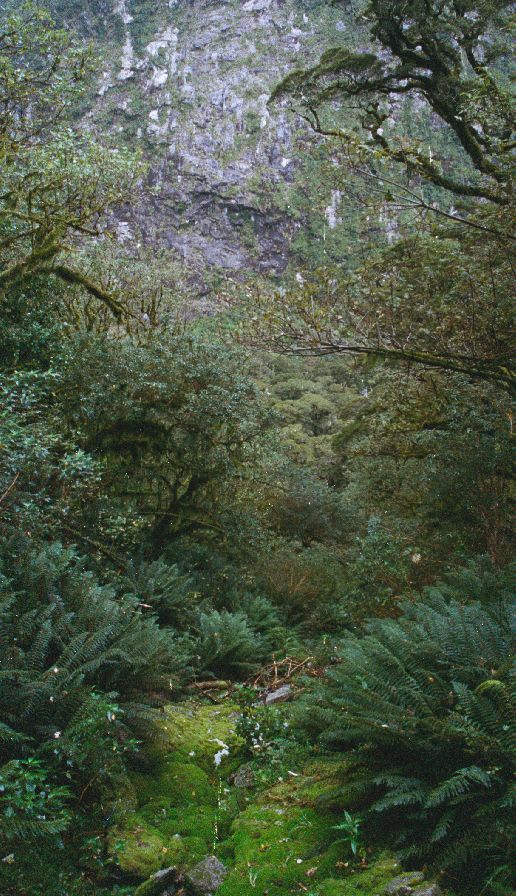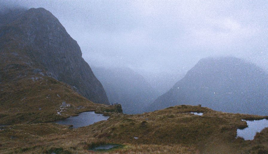 Surprisingly I didn't sleep well last night, and annoyingly people started getting up and packing at five - hours before dawn - someone was even using a very loud electric razor! I set off at eight thirty in a light drizzle. The first two hours were up a steep set of switchbacks climbing nearly two thousand feet to Mackinnon Pass. The panoramic views back down the valley toward Lake Mintaro were stunning (also a great excuse to stop and rest). As I approached the pass the drizzle graduated to rain and the icy winds made it seem as if it were raining sideways or even up! It was very cold. The pass is nearly four thousand feet (1,154 m) above sea level, unfortunately the low clouds made for poor visibility and you couldn't see the peaks that surrounded us. But the walls climbing away from us, and the glimpsed views down the valleys were exciting, and the clouds made everything seem closer and more intimate.