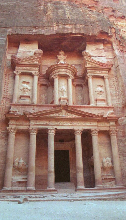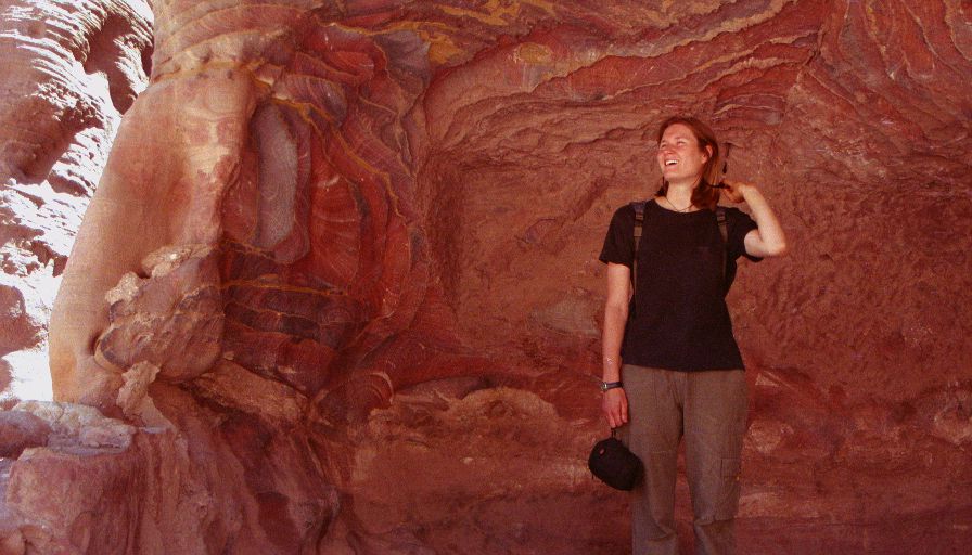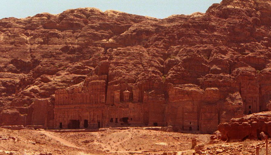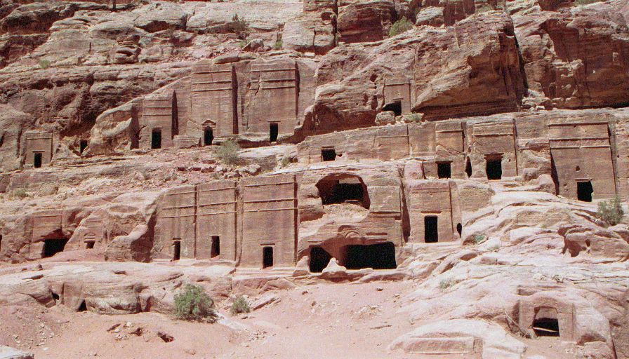 We explored the Treasury inside and out then continued into the heart of Petra. We wandered through the canyon to the half buried facades and gapping windows and doors of the Necropolis (Street of Facades) - all wonderfully organic in their eroded state and decorated with the most incredible swirls of color (reds, blues, yellows, and black) in the exposed rock. Further down the canyon we passed the Amphitheater situated where the canyon starts to open up to the flatter central area. Wandering through the newly restored Market place we climbed up to check out a couple of digs that were going on (looked pretty boring). Along the colonnaded street (a few restored columns, but hundreds of sections of columns could be seen in the surrounding rubble) and through the Temenos Gateway to the large Qasr al-Bint. It's on of the only free standing buildings in Petra and looks typically roman in its construction - completely failing to compete with the Nebataean's carved buildings.