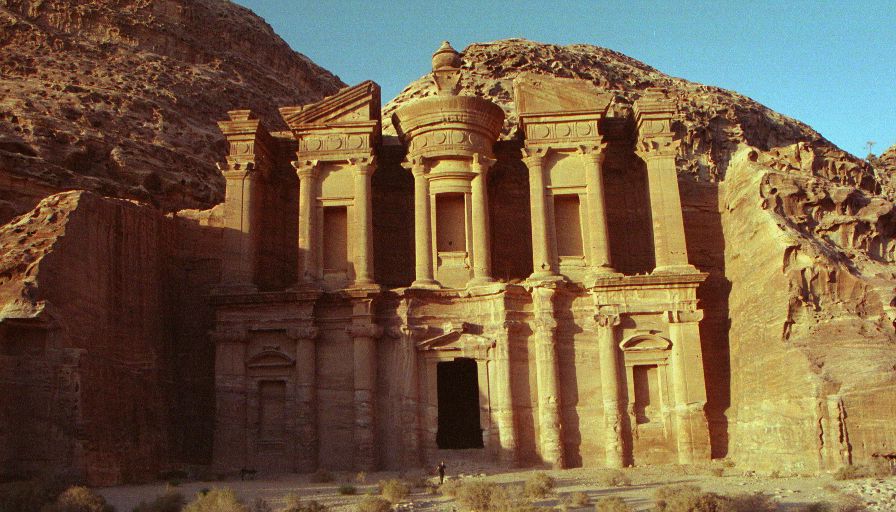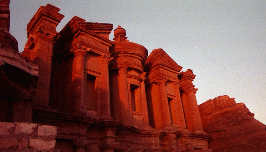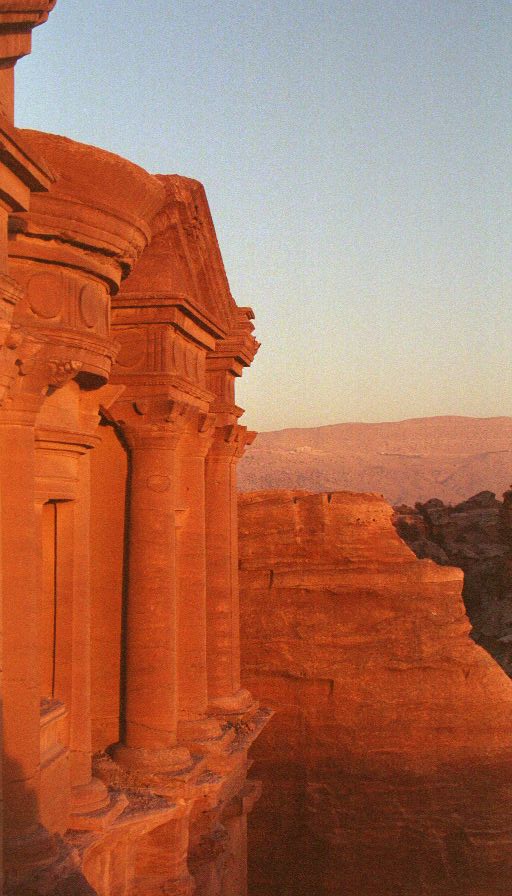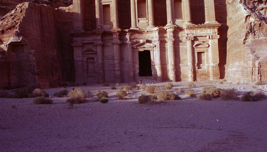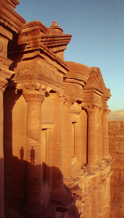 We wandered back into the Siq passing a few other tourists on their way out. We paused to admire the Treasury in the afternoon light - a beautiful deep red color - then hiked at a decent pace back through the central are to the steps leading to the to Ad-Deir (the Monastery) - we were told it's a thousand steps - and I think I believe it. Half way through the hike we paused to admire the Lion Tomb but by then it was starting to get late. We passed a couple others returning, but by the time we finally got there it was nearly seven o'clock and we had the place to ourselves - although a couple English guys showed up a few minutes later.