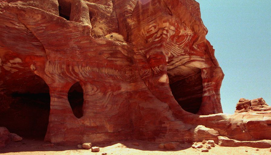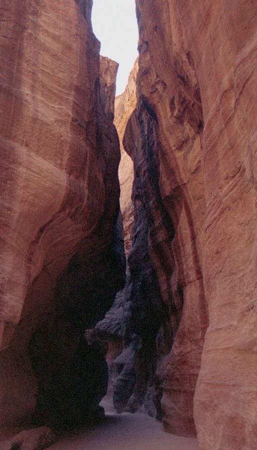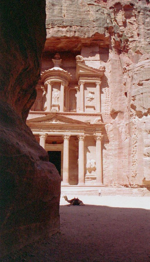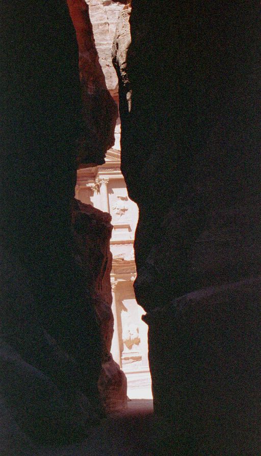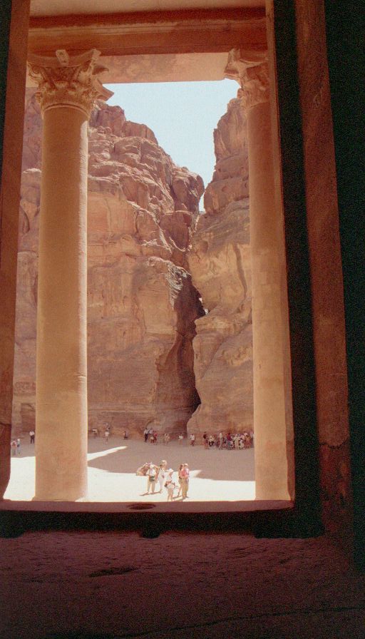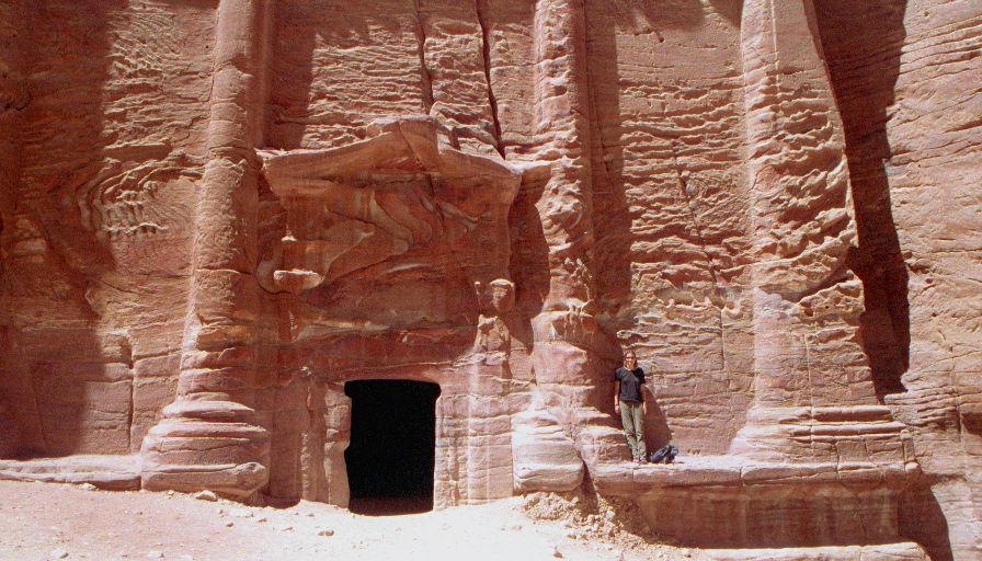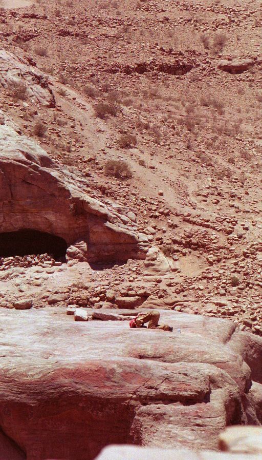 We had planned on spending the morning in Petra then taking cover during the hot hours in the middle of the day then returning in the evening - but by this time it was two o'clock - and very hot. We moved as quickly as we could back into the central area then along the far side and up on to the balcony where the Royal Tombs are. We explored the cool (relatively) vaults underneath the Corinthian Tomb (?) and then the tomb itself. We hiked past the rest of the Royal Tombs (Palace, Corinthian, Silk and Urn Tombs) to a stairway across from the Amphitheater. Then it was back to the Treasury, and into the Siq. As before it was amazing how much longer the hike back to the town (2 miles) takes.