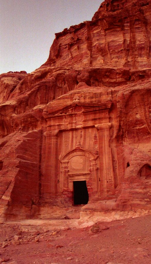 The plan had been to drop down into the canyon on the other side then wander back in the the central area past many tombs / fountains / rooms / who-knows-whats. We started down what we thought was the trail but it turned out to be a dead end. After about 30 minutes of searching for the right path we started to panic as the sun was sinking fast so we headed back the same way. At the top of the stairs we ran into someone who pointed out the right way and we were able to follow the stairs down past the Lion Fountain (the relief of a lion that was once plumbed to be a fountain - 2,000 years ago!) to the Roman Soldier's Tomb (a fairly well preserved facade with three torsos decorating it). We then wandered down the canyon past the Garden Tomb (a tomb I took shelter in from the rain last time I was here), the Triclinium, and numerous other facades. We finally made it within sight of the central area but we couldn't figure out how to get to the valley floor without hiking way back - and it was starting to get dark. We ended up scrambling over a couple slopes, hopping a couple small walls, then descended through the amphitheater. Just before we got back to the treasury we were met by a police officer who escorted us, as the last visitors of the day, to the Siq.