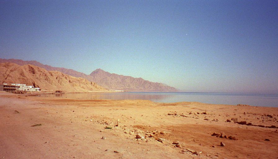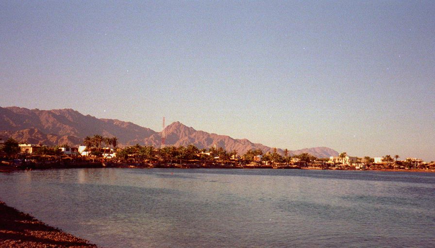After the dive we decided that we had pushed the limits a little close and decided not to do a second dive - even though the computers said all was well. We headed back to Nesima very excited but not sure whether we should admit to what we'd done. At Nesima we hung out and filled in the paperwork associated with our dive masters application. I had a late lunch and spent the afternoon calling clubs in Sharm el-Sheik to see if I could arrange a dive on the Thistlegorm. I found one place that sounded like they could do it but when I called back they refused me. Since I couldn't find the dive I wanted Stacy and I decided to stay another night in Dahab. Nesima had a dive trip going to Ran Mohammed National Park (down past Sharm) tomorrow but it was uncertain that we could get on it. We decided that if we could we'd go do that, otherwise we'd spend tomorrow in Dahab - either way we'll be on the overnight bus back to Cairo tomorrow. I headed into the village to check the internet and see if I could buy a couple books since I have a lot of travel hours ahead. When we got back to Nesima we had our spaces confirmed for the Ras Mohammed trip - so it was back to the Yasmina to check in. We'd were planning on going snorkeling on Nesima reef to use up the rest of the film in the camera, but ended up just shooting it around the pool bar.