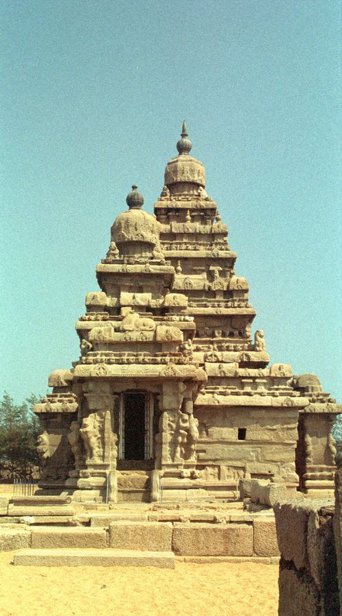 After leaving the temple we stopped at a sari factory where I expected the hard sell. The weaving was actually pretty interesting, and there was a hard sell - but it wasn't directed at the foreigners it was directed at the Indians! Almost everyone on the bus bought something - some buying saris costing several hundred dollars! From Kanchipuram to Marmallapuram was a fascinating two hour drive through the countryside and many small villages. There were hundreds of cows with painted horns. The horns were always painted bright secondary colors (red, yellow, green, and blue were the most common). Sometimes both horns were painted the same color, but most often each was a different color. Stripes were common as well, and at least once I saw multi colored dots. Many of the cows pulling carts also had elaborate brass sheathing on the tips of the horn - usually with bunches of bells attached. I loved them, they looked very cool. Unfortunately I only ever saw them in the villages and in the country and all my photo attempts failed.