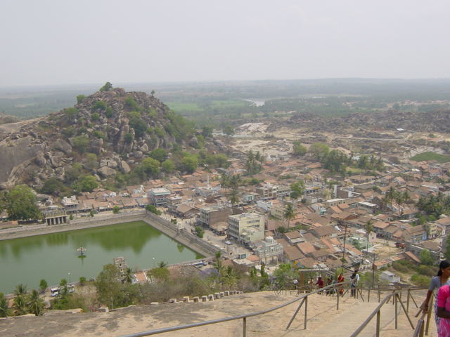 I got up at six thirty to get ready for my tour. I'm taking a bus tour out to the temple complexes at Sravanabelagola, Halebid, and Belur. It was far from cold, but cool enough for me to be happy about having hot water. The start of the tour was fairly typical - i.e. slow. After picking everyone up the guide collected the tour vouchers and we then had to drive around to everyplace that had sold the tour and collect the money. Then stop at the gas station to fill up. Then lastly at a drive up temple where the guide paid to have himself and the bus blessed (he got a dot, the car got a yellow and vermilion Omm drawn on the windshield). I like the group of people I'm with - I'm the only non-Indian so there's a lot of curiosity. I think I've decided the reason I don't mind tours in India is because they're still a cultural experience for me. In most countries if you get on a tour you are only with other foreigners, why bother to be in the country at all? Here in India the others are almost invariably mostly from other parts of India - so I get a chance to learn about what the tour is showing, plus about the people of India.