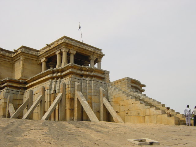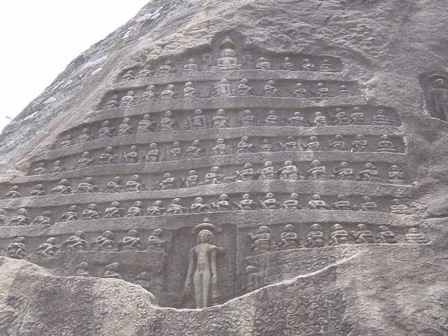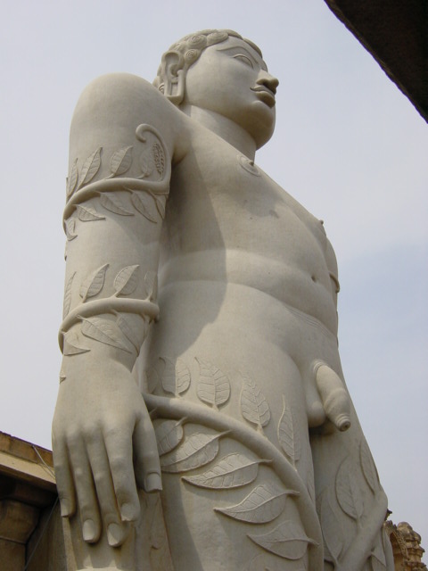 We drove for about and hour and a half the stopped for an hour for breakfast (I had a dosai and poori with the usual dahl and coconut chutney - it was very good). From the restaurant it was only a half hour drive to Sravanabelagola. Sravanabelagola is a small town with two out of place hills in the middle. There are temple complexes on top of each of the rocky hills. We hiked up the taller of the two hills (Vindhyagiri) to the giant statue of Gommateshwara (the Jain saint - a contemporary of the Buddha). It was a long hike up 700+ steps carved into the rock. In my rush this morning I'd forgotten to heed the guidebooks advice and didn't bring socks. Since the hike has to be done barefoot that could have been a very painful experience, luckily we were early enough that the rock wasn't blistering hot yet. At the very top of the hill is a large (~50 foot) monolithic statue. It's a bit strangely proportioned but conveys a great sense of peace. The standing figure is nude (Jains are absolute minimalists) with finely carved stone vines running up its legs. It was all pretty impressive, but from talking to other travelers I'd heard it compared to Petra as one of the great sights of the planet, and it's really just another large Buddha type statue. We got to spend an hour in Sravanabelagola then it was back on the bus for the two hour drive to Halebid.