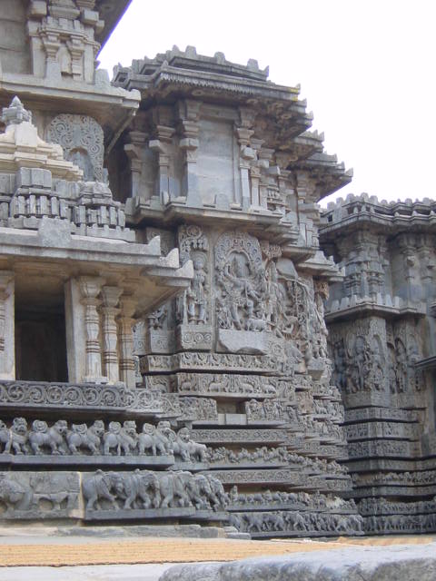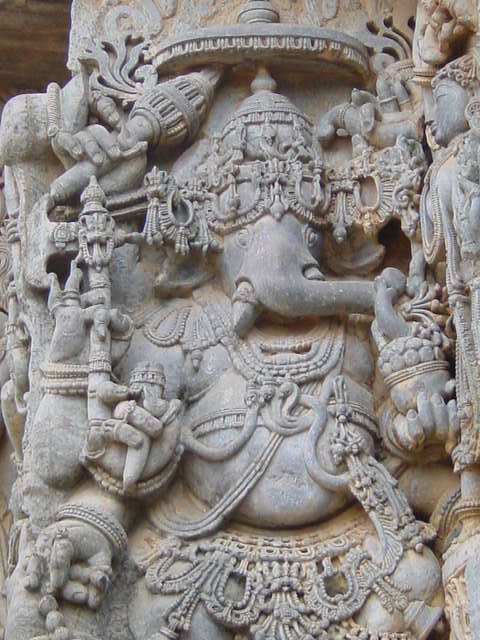 Another two hour drive got us to Belur. We stopped and hour for lunch which was ok, but I was starting to get annoyed that they were allotting more time for eating than at the temples. We visited Chennakesava Temple, another twelfth century temple. It also is covered with incredible carvings - almost as good Hoysalesvara. In fact it was never looted so there is less damage to some of the carvings. It's built on a star shaped platform which houses several small shrines. The temple is smaller than the last one (there are "only" 650 elephants on the base row - again all different). Here we were only given forty minutes - only enough time to walk around and through the structure once - not even enough time to even glance at the carvings on the courtyard walls (they looked good from a distance). Then it was a very long drive home.