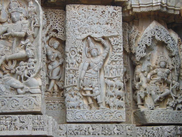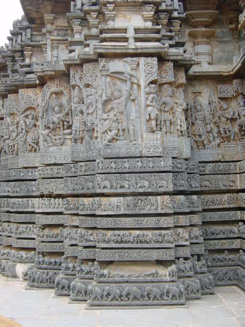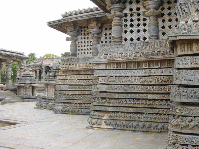 In Halebid we went to the Hoysalesvara Temple. The twelfth century temple is very impressive - exquisite carvings cover every surface inside and outside. Besides the main temple there are two columned platforms each with a large statues of a bull flanking it. The carvings really are amazing. the entire temple is banded with six rows of carvings - starting at the base with a row of elephants (more than 1,000 of them and each one different), followed by a row of lions, a row of horsemen doing battle, flowers, then a row of friezes depicting incidents from the epics (mostly the Ramayana - though there were also my favorite showing positions from the Karma Sutra!). I definitely felt rushed at this stop - we were told we had an hour, but after fifty minutes I was almost forcibly dragged back to the bus - two hours would have been better.