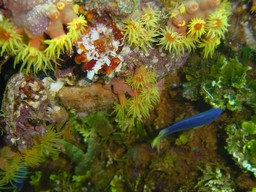 - 6129. Encrusted oyster and blue fish, Wreck of the Fujikawa Maru, Chuuk, Micronesia