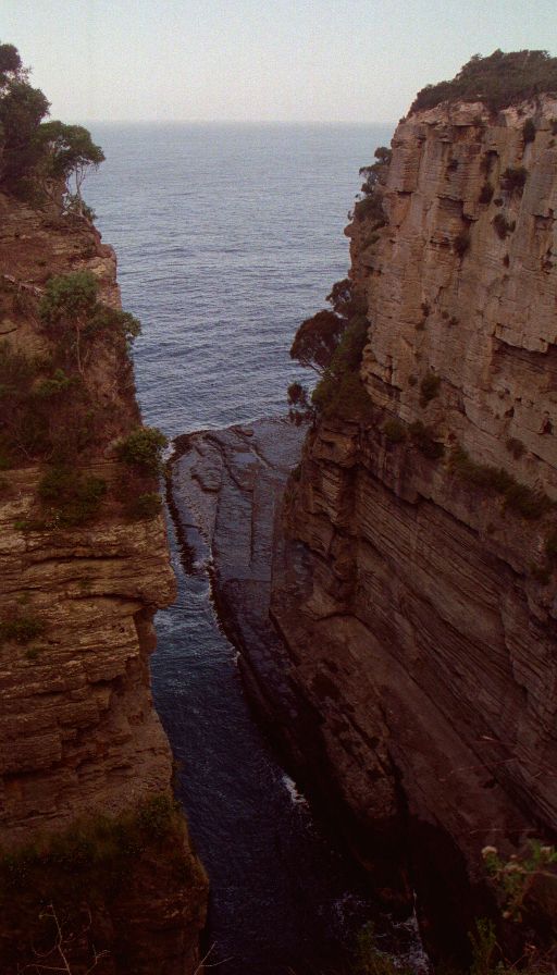 The coast is spectacular - lush green forest on rocky cliffs plunging directly into the water. Did a quick drive through the Pirates Bay State Reserve - pretty, but nothing any different from all around. In Tasman National Park I went to see the Tasman Arch and the Devil's Kitchen - both dramatic coastal rock formations.