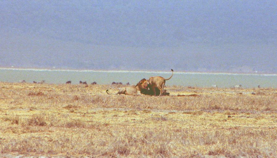 By far the highlight of the day was the lions. Near the beginning of the drive we found a group of lions feeding on some earlier kill. They were quite some distance away, but Winston decided they were going to move because some Masai were bringing their cattle to drink at a nearby water hole, and parked the car where he thought they might go. There were about ten lions and as predicted they soon moved away from the water. They went different ways, but three of them came right at us. The largest of the three was a huge female whose entire muzzle was soaked in blood - she and two other lionesses brushed against the back of our car as they walked by - less than four feet below us! Even better the large one stopped and made eye contact scarcely a yard away. We also saw several smaller groups, and lone lions - though none as close. Later in the drive came on a male and a female feeding on something - they weren't that close, but close enough for some great pictures (I hope...).