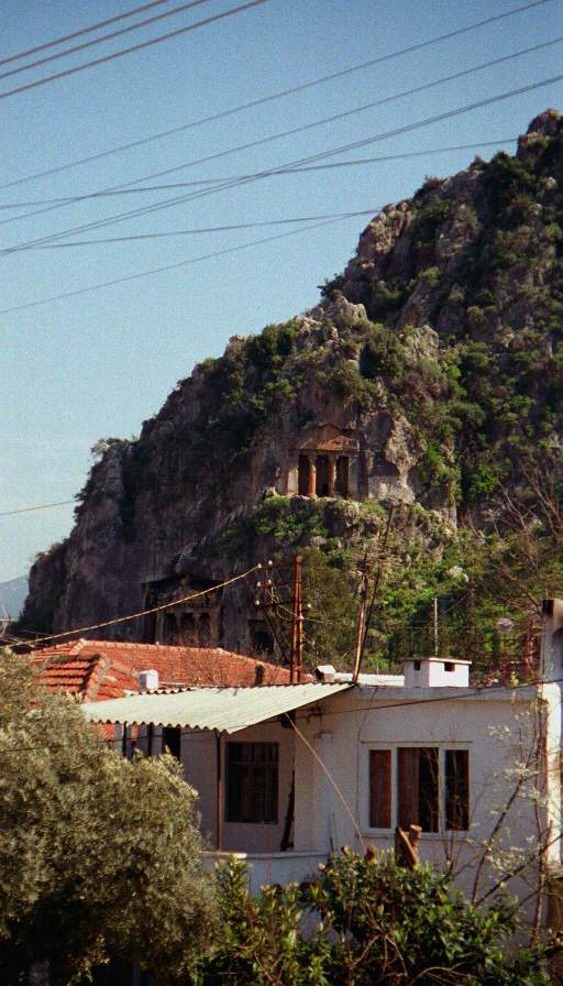 Woke up at dawn after a hellish night on the bus. I was stiff and desparate to get off the bus, but at least with dawn I could watch the country go by. I expected to get to Fethiye at about 10, but in reality it was almost noon by the time we got there (almost 18 consecutive hours on the bus). At Fethiye I left my pack at the bus station and walked the 3km to the harbor. I had lunch near the water, then hiked up to the immense tombs carved into the side of the cliffs outside of town.